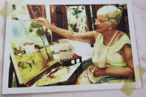 Quem frequenta a Região Oceânica de Niterói, por certo ao percorrer a via que leva ao Túnel Charitas antes da última Estação do Ônibus, quase chegando ao Clube da AABB, tem a atenção desviada para uma grande vitrine de uma casa verde, uma espécie de galeria, onde o seu interior é ocupado por grandes telas de pintura. É lá o atelier do nosso pintor e onde durante anos também funcionou uma escola de arte com artistas vindo de vários bairros e cidades da vizinhança. Foi nesse espaço que em 2008 levei minha mãe que havia sofrido um AVC para retomar a vontade de viver, de fazer, de criar através da arte. Isto é só um spoiler mas, posso voltar ao tema num próximo programa do “Falou e Disse”, por hora deixo apenas uma foto que marcou o acontecimento.